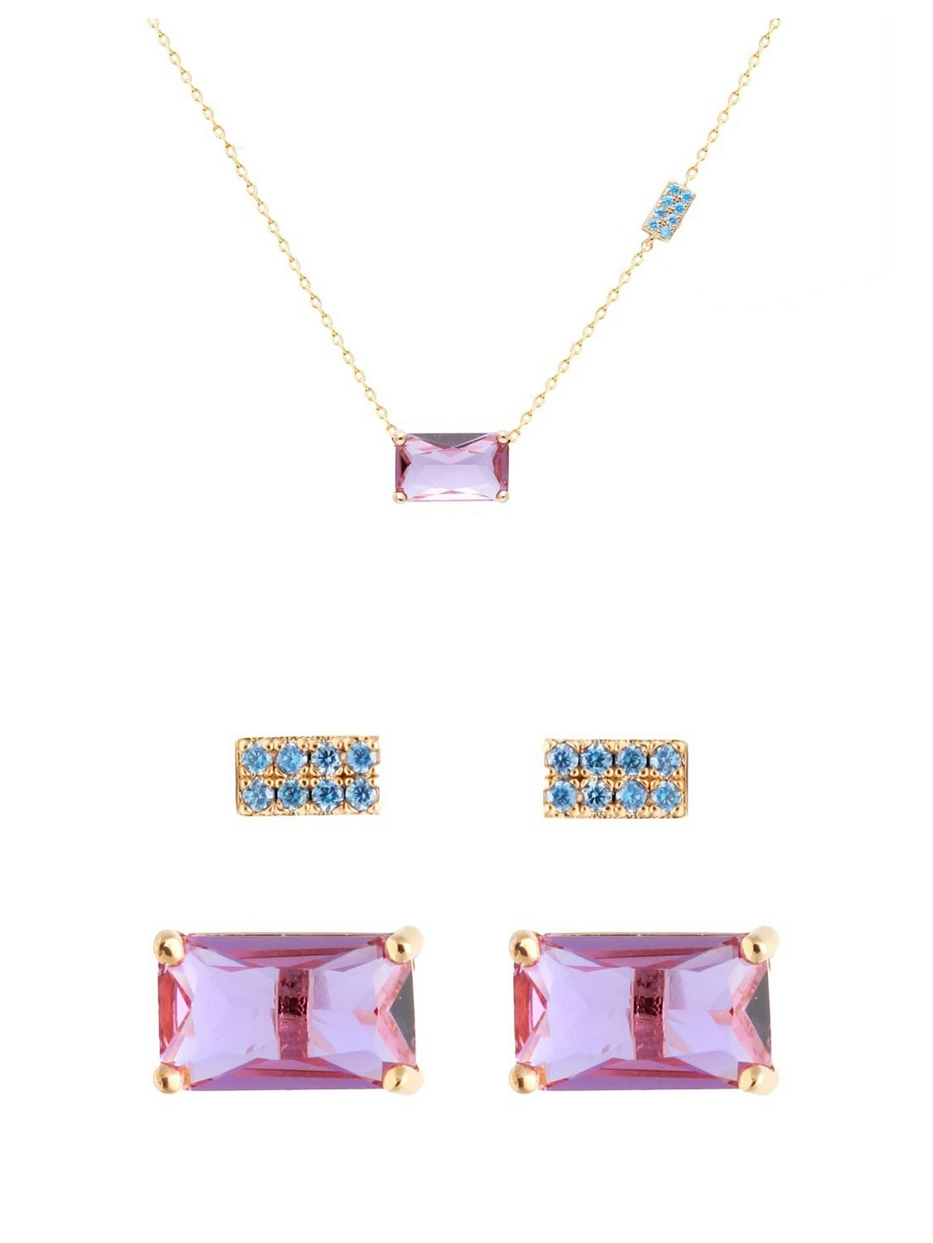 Conjunto de colar e kit de brincos retângulos ametista e zirconias turquesa