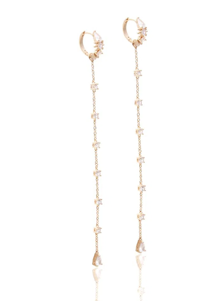 Brincos argolinha e corrente longa removível cravejada com zircônias cristal