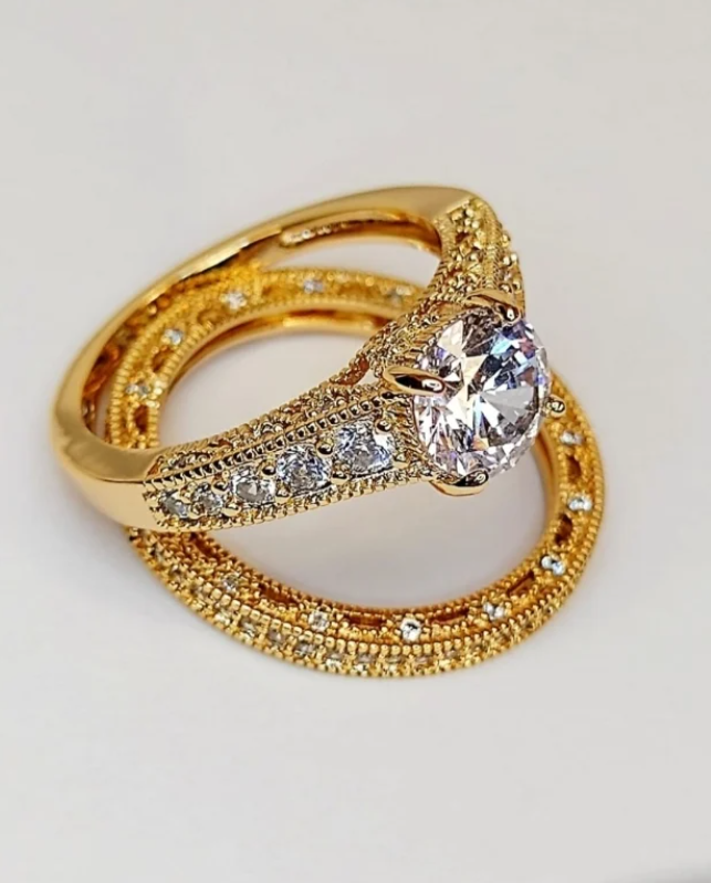 Anel duplo solitário e aliança cravejados com zircônias cristal