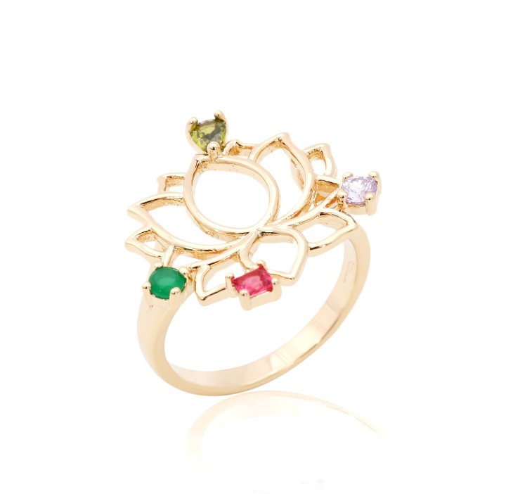 Anel flor de lotus G cravejada com cristais esmeralda, turmalina rosa, peridoto.