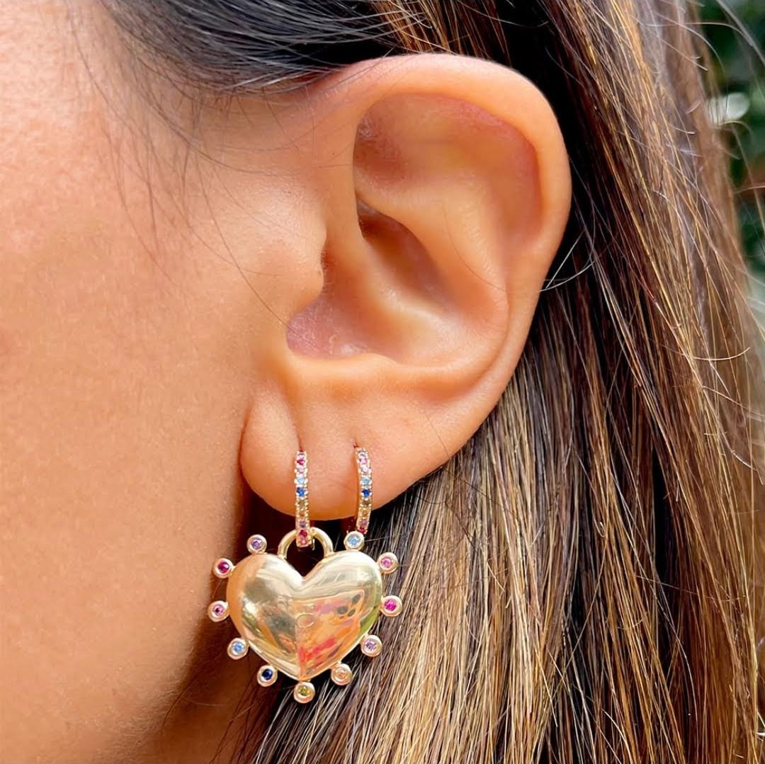 Brinco argola 2 em 1 com pingente coração cheio cravejado zircônias color nas laterais.