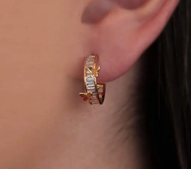 Brinco argola aberta banhada no ouro 18K cravejado com zircônias baguete cristal e borboletinhas lisas na lateral. Não possui níquel e, portanto, hipoalrgênico.