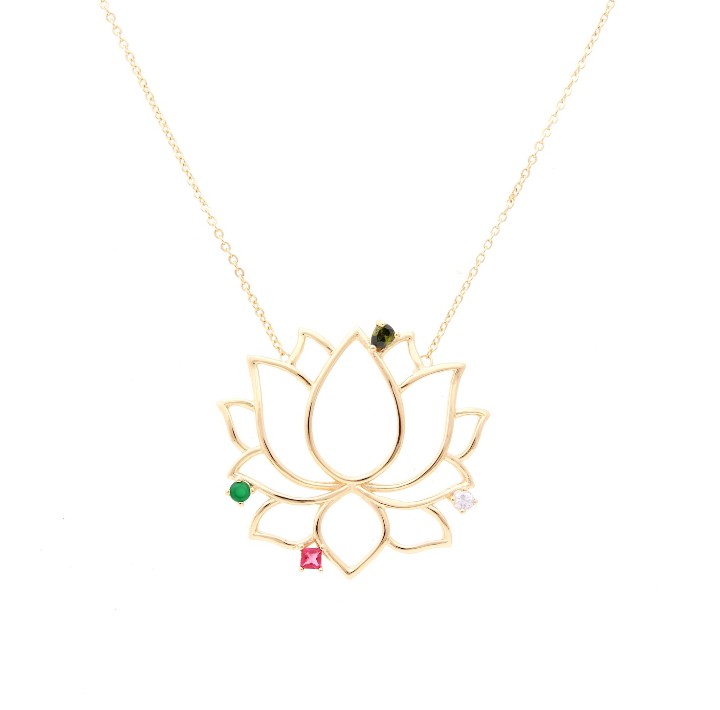 Colar com pingente flor de lotus G cravejada com cristais esmeralda, turmalina rosa, peridoto.