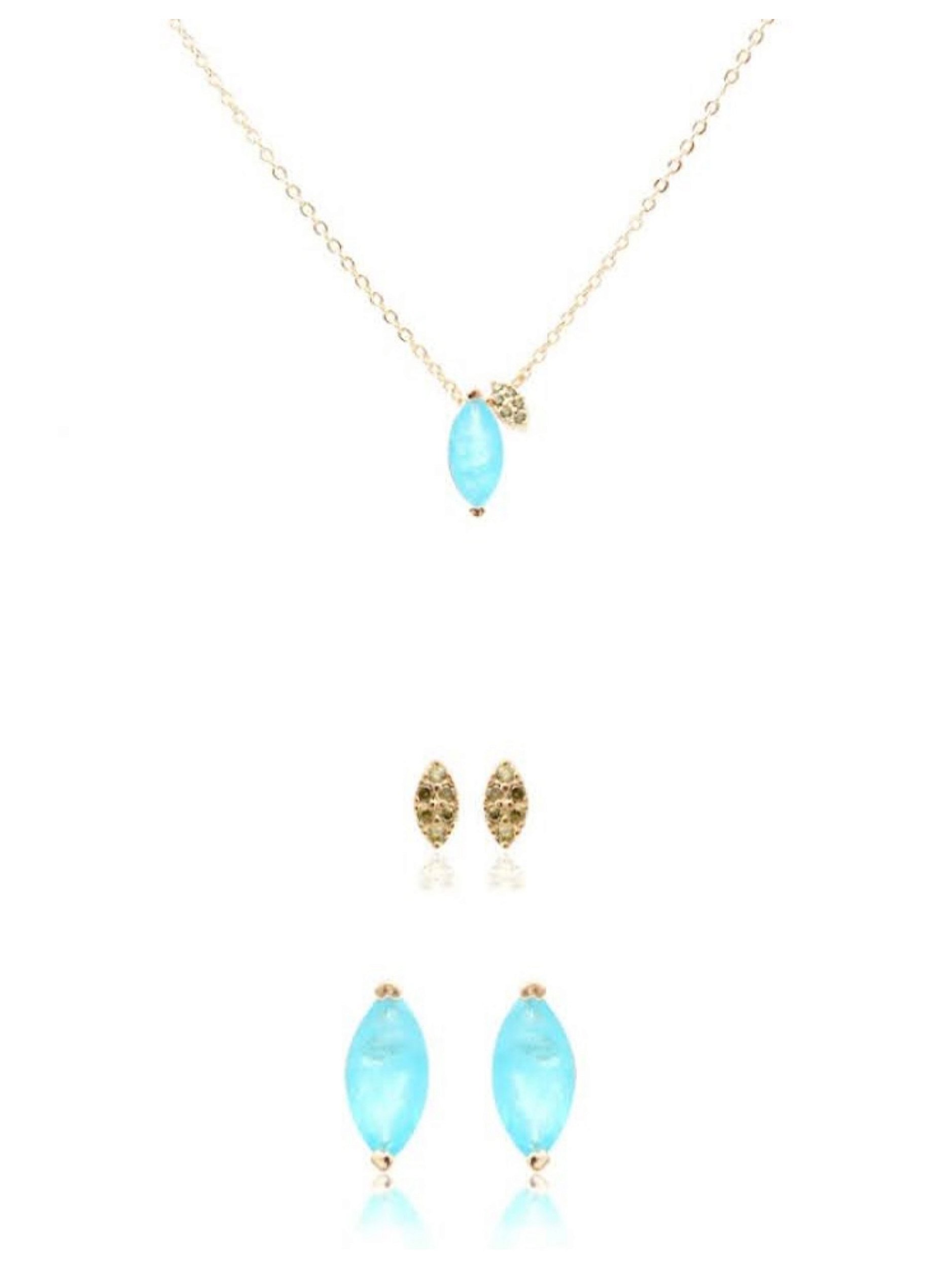 Conjunto de colar e kit de brincos navete fusion calcedonia e zirconias esmeralda