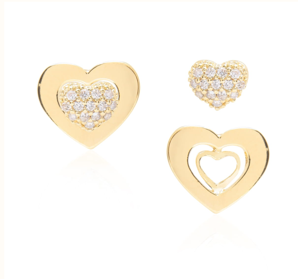 Brincos pino dois em um com coraçãozinho PPP cravejado com zircônias cristal