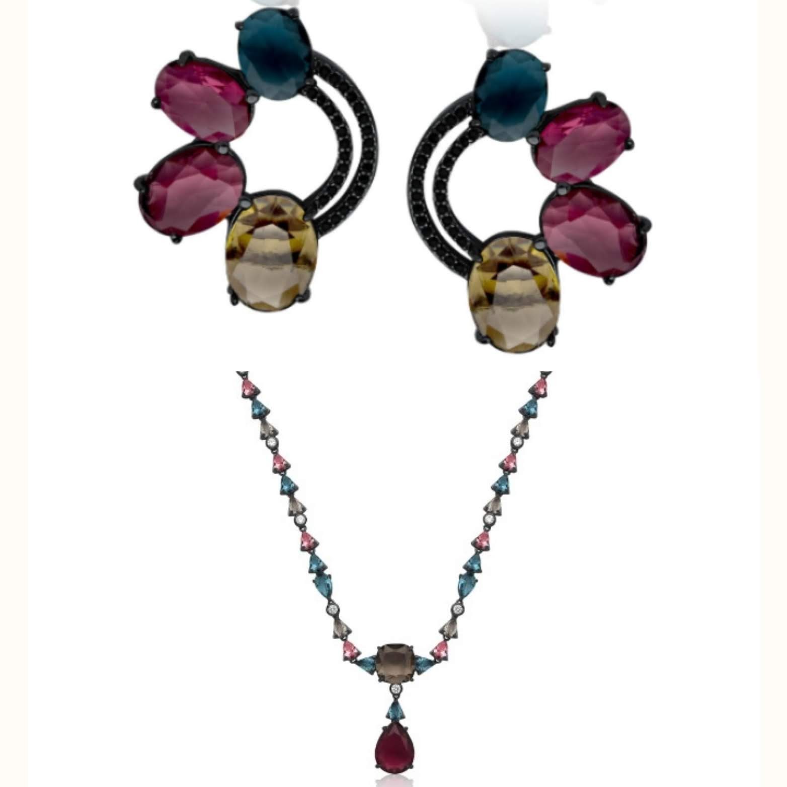 Conjunto colar gargantilha e brincos pino com zircônias color