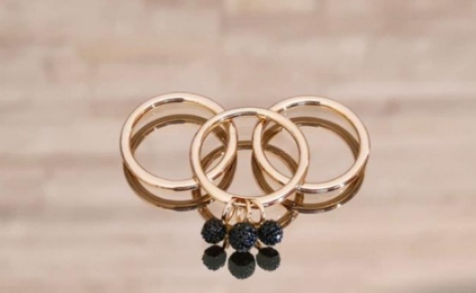 Anel com três alianças sendo uma com 3 pingentes de bolinhas cravejadas com zircônias negras