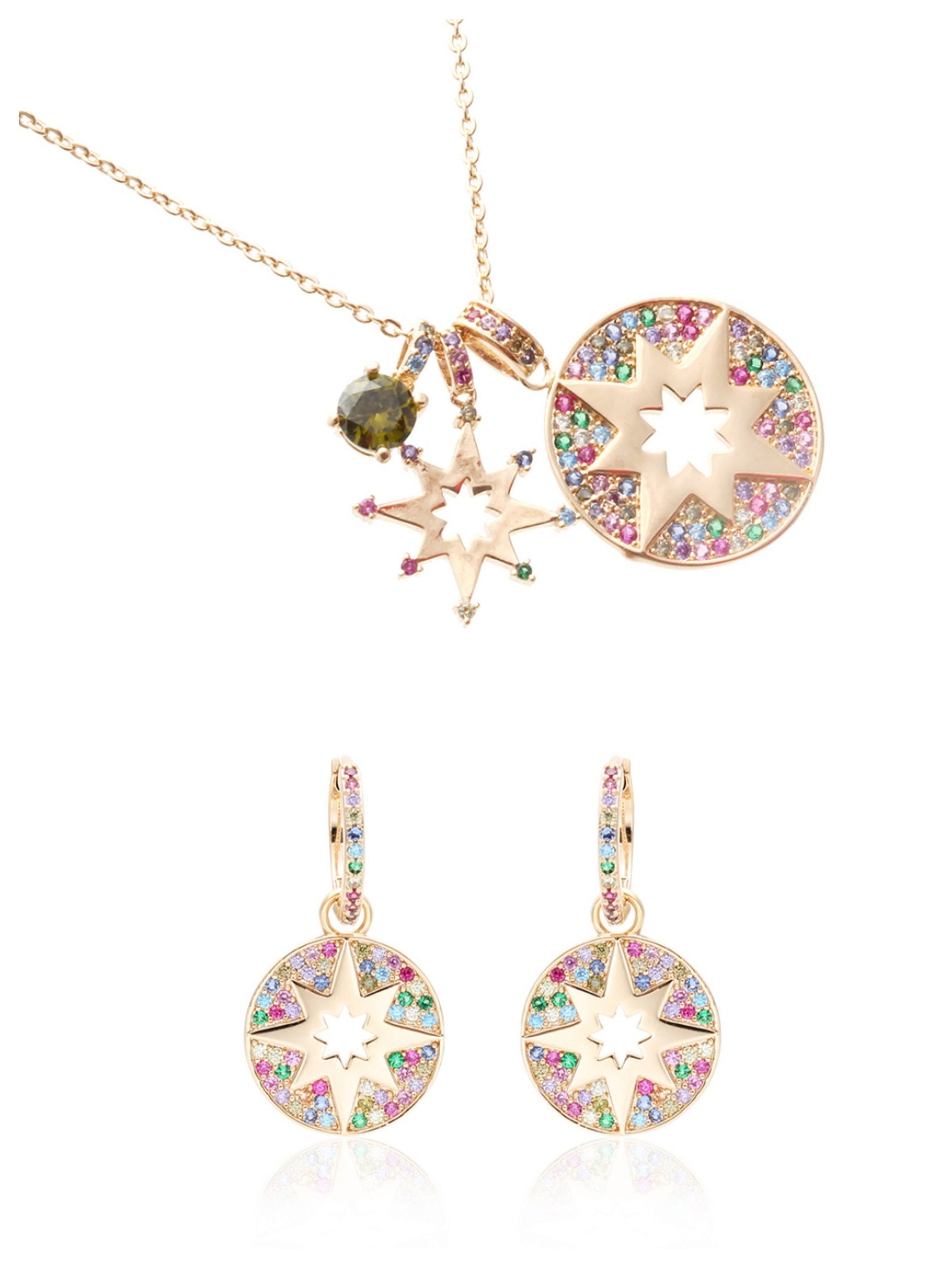 Conjunto colar e brincos argolinhas pingentes medalhas removíveis estrelas cravejadas com zircônias color