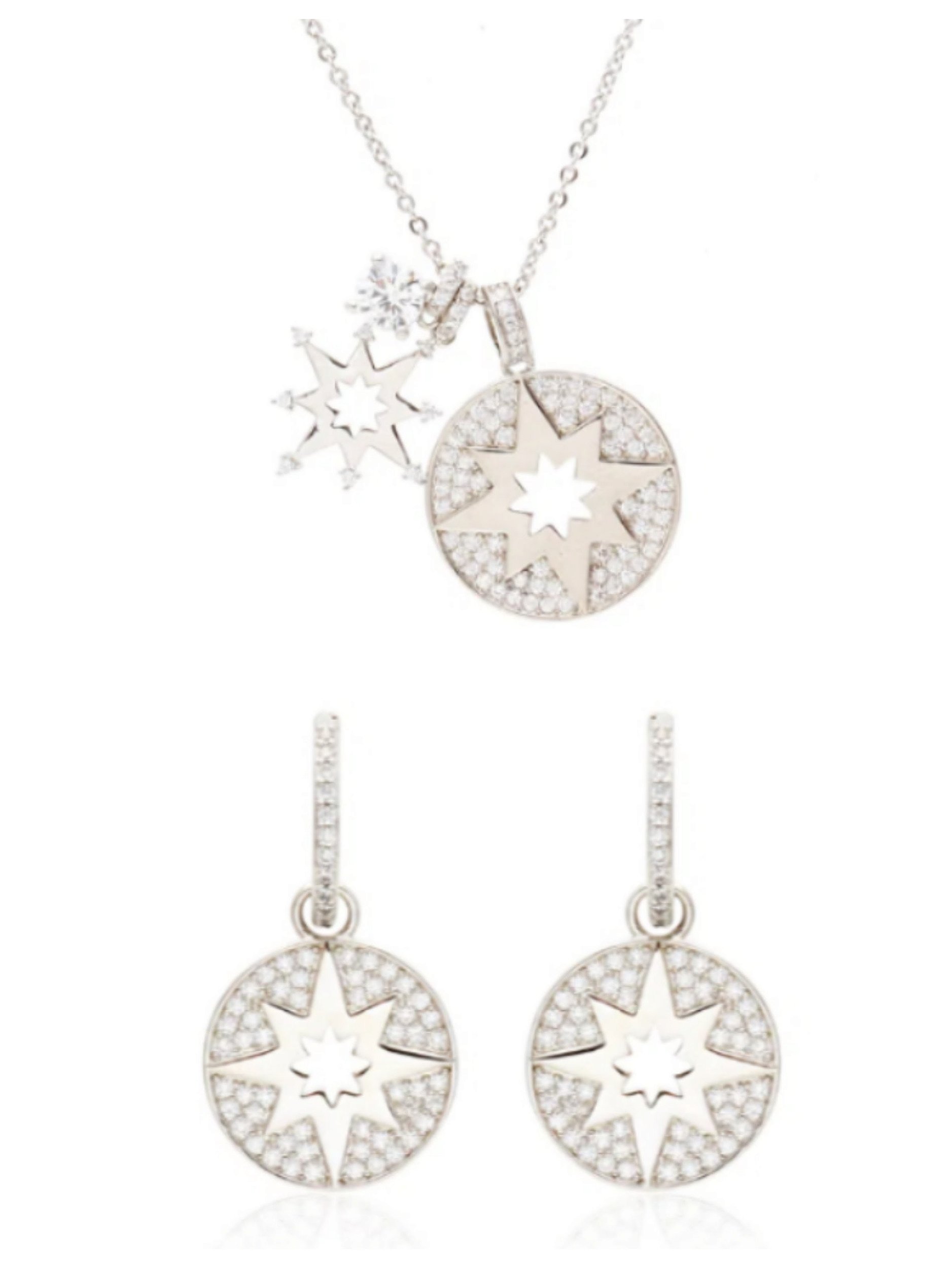 Conjunto colar e brincos argolinhas pingentes medalhas removíveis estrelas cravejadas com zircônias cristal